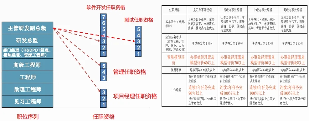 表一:內(nèi)外部人才作用方式 (二)人才評價(jià) 首先,素質(zhì)能力評價(jià)。依據(jù)公司各層級各序列崗位的人才標(biāo)準(zhǔn),借助外部人力測評單位每年對公司員工進(jìn)行測評與盤點(diǎn),建立公司的人才地圖,并為后續(xù)人才規(guī)劃、人才發(fā)展與培養(yǎng)提供支撐。比如價(jià)值觀評價(jià),阿里巴巴的文化基因:“獨(dú)孤九劍”——“六脈神劍”——“九陽真經(jīng)” ?!熬抨栒娼?jīng)”是在“六脈神劍” 的基礎(chǔ)上,增加了對領(lǐng)導(dǎo)力的特殊要求(眼光、胸懷、超越伯樂)。 其次,績效評價(jià)??冃гu價(jià)本質(zhì)上是管理者自我管理能力的檢視、目標(biāo)任務(wù)的管理以及員工發(fā)展輔導(dǎo)。建設(shè)常態(tài)化的績效管理機(jī)制,年度/季度/月度績效制定、績效回顧、績效反饋與輔導(dǎo)等,形成績效管理閉環(huán)。 (三)人才激勵(lì) 通過對公司內(nèi)外部薪酬激勵(lì)模式的分析,構(gòu)建崗位+能力+績效的“三位一體”的薪酬體系,來體現(xiàn)外部公平、內(nèi)部公平、自我公平;針對特 定人才,更應(yīng)該關(guān)注多元激勵(lì)機(jī)制與精神激勵(lì),從而打造行業(yè)能吸引人、能留住人、能用好人的管理平臺。 三、人才發(fā)展與培養(yǎng) 為更好地吸引與留住人才,企業(yè)應(yīng)構(gòu)建科學(xué)合理的人才晉升、人才梯隊(duì)、人才培養(yǎng)的管理機(jī)制,為公司發(fā)展提供多元化可持續(xù)的人才供應(yīng)。 (一)人才晉升 人才晉升管理機(jī)制是公司吸引與留住優(yōu)秀人才的重要方式之一。企業(yè)應(yīng)依據(jù)各級崗位的人才標(biāo)準(zhǔn)與人才特征,制定符合公司崗位職業(yè)發(fā)展通道。 首先,明確晉升通道。為員工搭建多通道,只要在本職工作上干得好,績效考核優(yōu)秀且達(dá)到各職級任職資格要求,就能夠獲得更高的名分和待遇,讓員工看見發(fā)展的希望。 其次,界定晉升標(biāo)準(zhǔn)。依據(jù)發(fā)展戰(zhàn)略與人才特征,按不同層級不同序列崗位建立詳細(xì)的任職資格標(biāo)準(zhǔn)體系。每年評定,與員工晉升、調(diào)薪、股權(quán)激勵(lì)、儲備發(fā)展等全面結(jié)合。 其三,設(shè)置晉升周期。不同類別人才晉升周期不同,級別越低、周期越短,級別越高、周期越長。一般1-2年。
